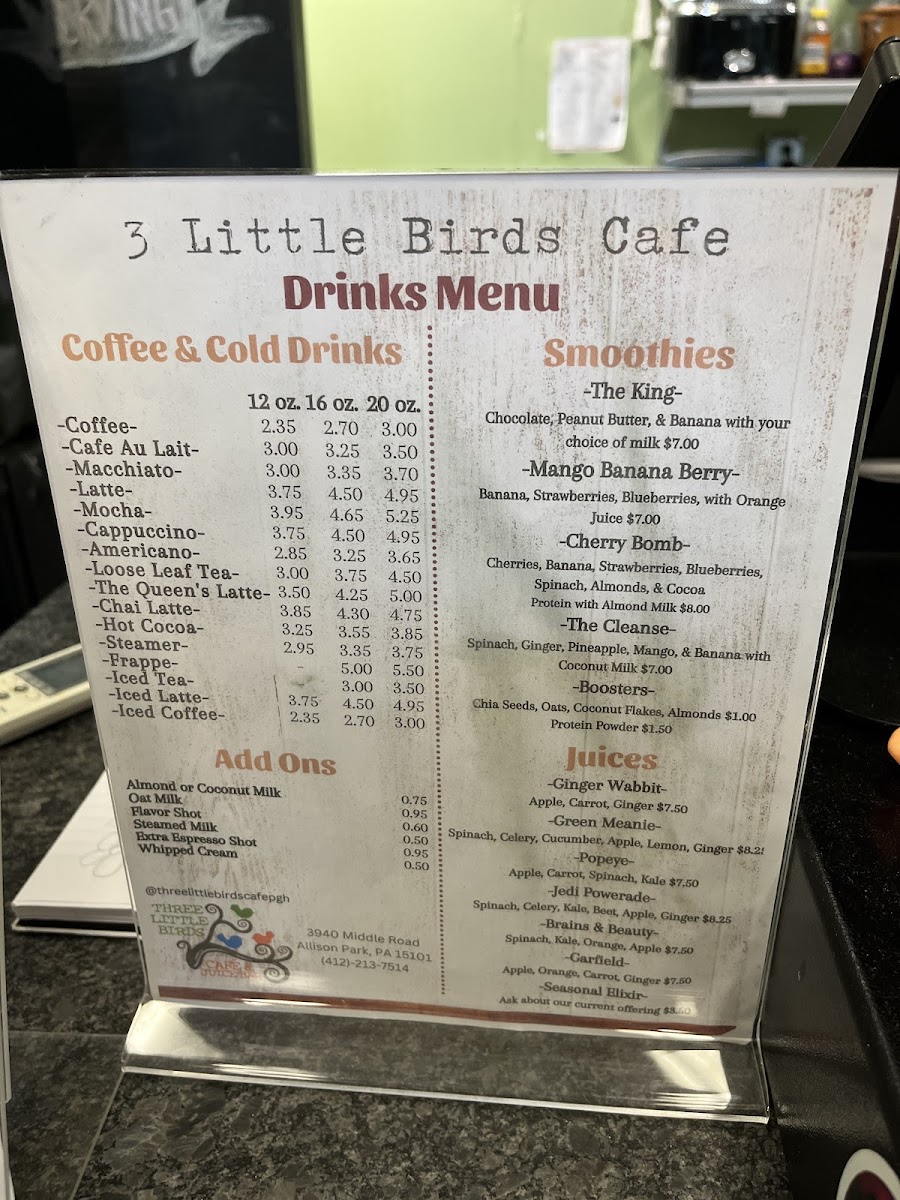 Welcome to Three Little Birds Cafe & Juice Bar, a charming spot located at 3940 Middle Rd, Allison Park, PA, where delightful flavors and inviting decor come together. Customers rave about the freshly brewed coffee, always served piping hot, and the cozy atmosphere that feels like home. The menu offers a diverse selection, with specialties like warm cinnamon rolls accompanied by fresh fruit and unique drinks such as matcha with sugar-free lavender syrup and invigorating green juices.